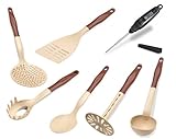 Features und Spezifikationen 6 tlg. Küchenhelfer Koch Set Kunststoff beige / braun Hitzebeständig bis zu 260 °C Spülmaschinenfest und Digital Einstich Thermometer